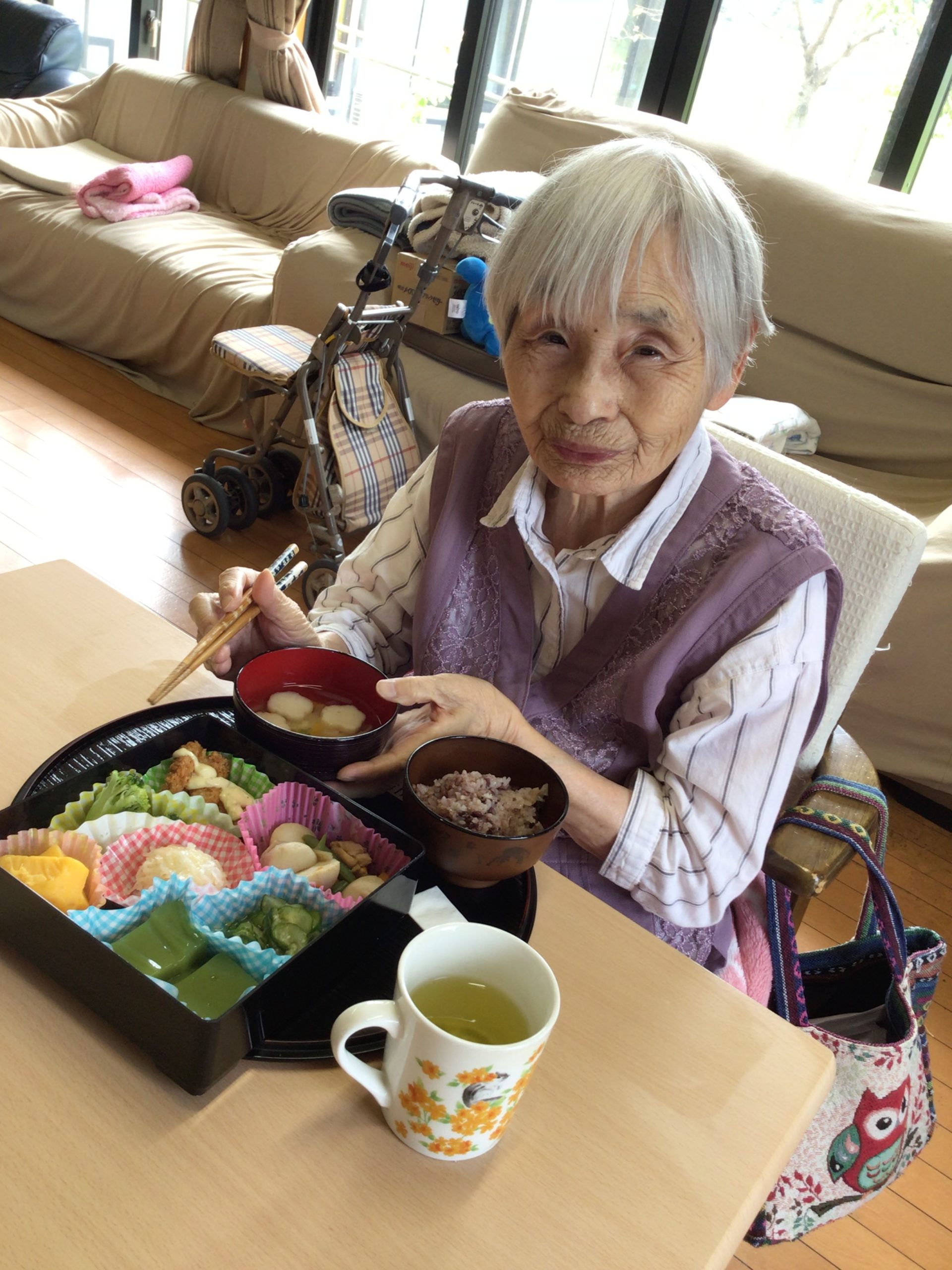 また、敬老会のお食事には、職員手づくりの「松花堂弁当」をご用意しました。見た目も華やかで、入居者の皆さまから「とても美味しい」「お祝いらしくて嬉しい」とたくさんの笑顔が見られました。